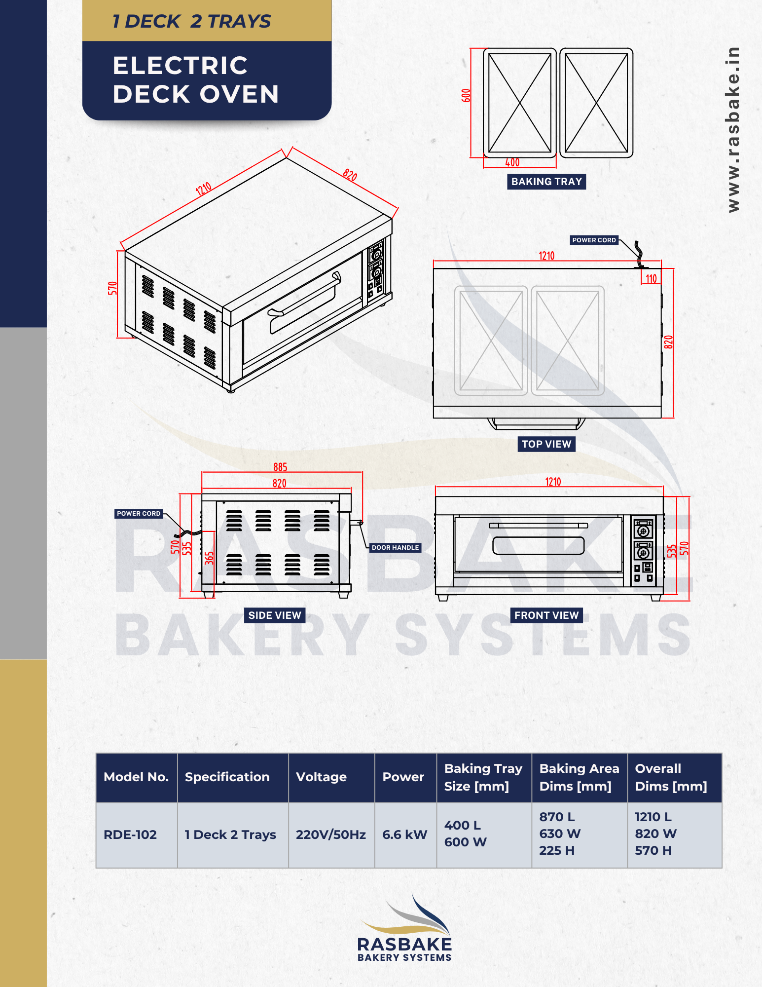 The Rasbake RDE-102 Electric Deck Oven combines expanded capacity with professional-grade features to meet the demands of growing food businesses. With double the tray capacity of our basic model and enhanced usability features, this oven delivers consistent results for medium-volume operations while maintaining an efficient footprint.