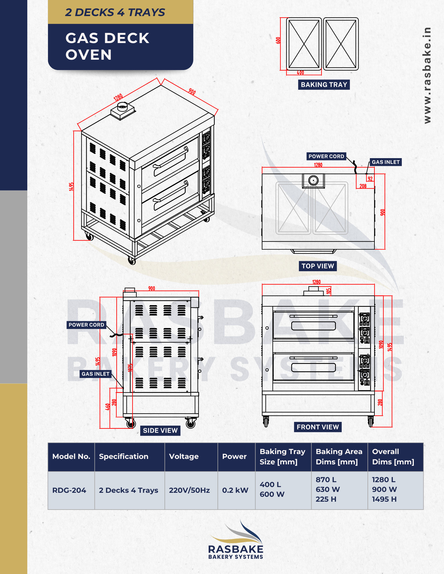 The Rasbake RDG-204 Gas Deck Oven delivers professional-grade baking capacity with the added advantage of mobility. Designed for kitchens that value both high output and operational flexibility, this double-deck oven combines gas efficiency with thoughtful features that enhance daily workflow.